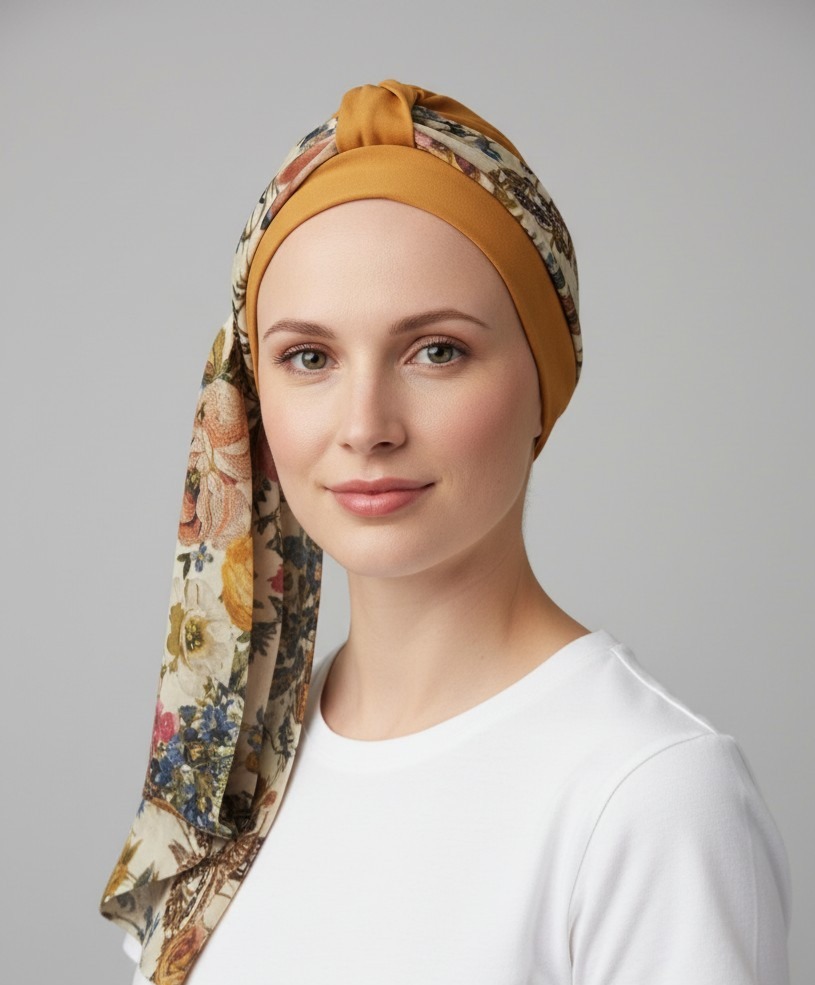 O design intuitivo permite que você coloque e ajuste o turbante e o lenço rapidamente, sem dificuldade.